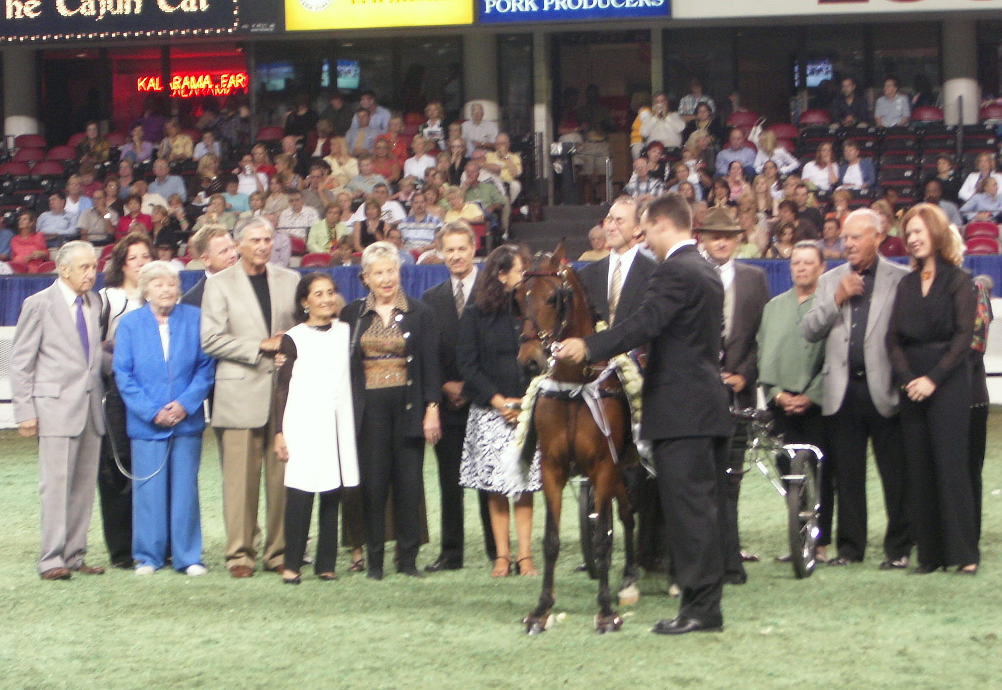 Joining us in the center of the ring are several people who have been an integral part of the life and career of this remarkable pony. Morgan’s husband, Dr. Preston Wolin, Morgan’s mother and sister who have been riding with Morgan her entire life, trainer Ray Krussell, Wendy Carney, Dr. Alan Raun, the George Smith family, Anne and Sam Stafford, Julia and Steve Joyce, along with the Cat’s favorite caretaker, Pedro Martinez. Unfortunately, the Cat’s most ardent admirer, Sally Parker, couldn’t make it tonight from her home in Maryland.