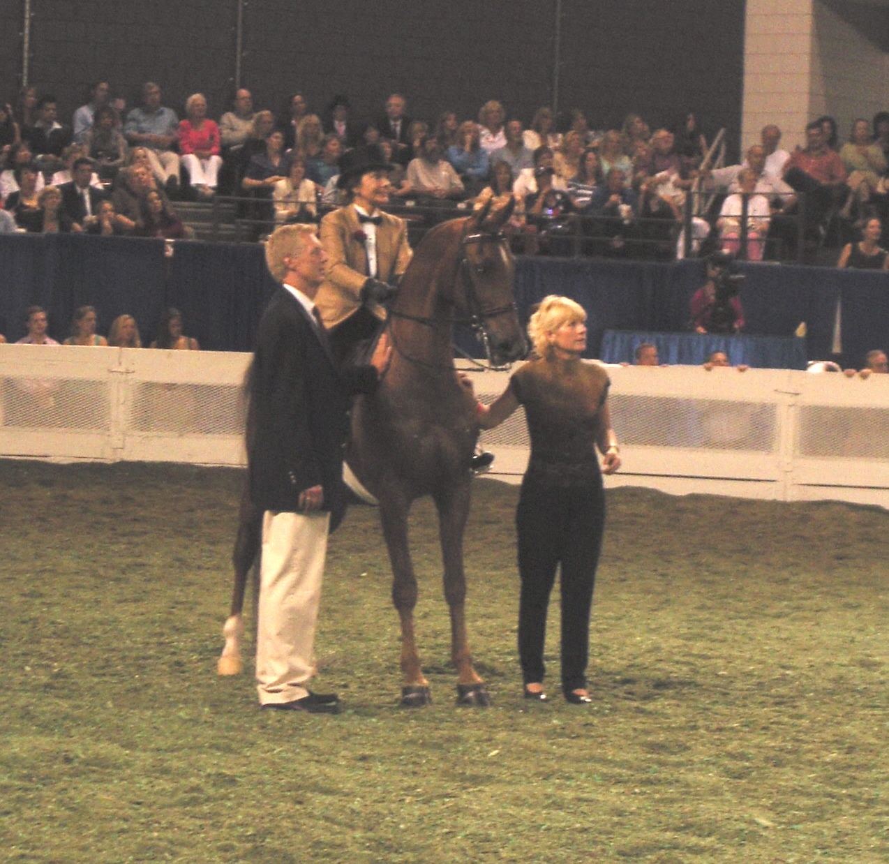 Now, as the photographers take their pictures, let me introduce those who are here with Jazz Man tonight. Please welcome Phillipa’s mother, Mary Jane Sledge, who last year was inducted into the World’s Championship Horse Show Hall of Fame, recognizing her lifelong contribution to this breed. And their friend of a lifetime, Dorothy Dutel. Also present are Nell Puls, Phillipa’s sister, her husband Jack, and her daughter, Mary Nell Betancourt.