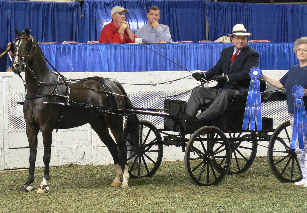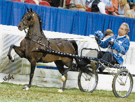 Golden Creek Farms’ Heartland Production is one of those who made a successful switch between harness and pleasure driving to roadster pony. Mary and Jeff McClean share the drives on this world’s champion pony. They head into Louisville with blues and tricolors from Lexington and Midwest in their 2007 record.