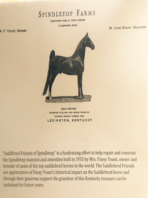 LEXINGTON, KY. - The “Saddlebred Friends of Spindletop” campaign officially kicked off Saturday, April 18, 2015, at Spindletop Hall, the former home of and farm of Pansy Yount renowned Saddlebred owner and breeder.