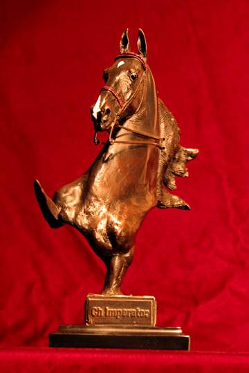 CH Imperator is the new release of the American Saddlebred Museum’s 2005 Legends in Bronze series. Sculptor Douwe Blumberg has captured the presence and attitude of the legendary horse. CH Imperator joins the distinguished company of CH Wing Commander and CH My-My, the two previous editions.