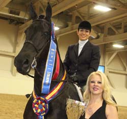 Rachael Stokes rode Mariken to win the Friesian Hunter Pleasure Championship and Grand Championship at the inaugural Friesian World Cup Horse Show in Las Vegas for owner Marilyn Lane.