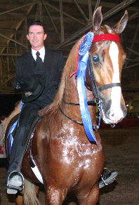 At Louisville in 2006, Blevins was on the lookout for a horse to develop for the amateur ranks for Sandefur to ride. A striking chestnut sired by CF First Night Out and out of Suzy’s Lady Bug, by CH The Talk Of The Town, caught his eye. Matt Shiflet showed in the two-year-old class, lost two shoes and had to be excused. The colt made such an impression on Blevins that he asked Shiflet what he thought about preparing the youngster for an amateur rider. Shiflet replied that the colt was a good thinker and he believed it was a great plan. Blevins tried the colt on Sunday morning after Louisville ended.