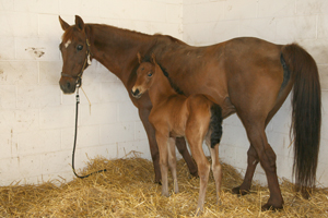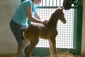 Jennifer Hazen works with this newborn colt by Whispering Whammunition and out of Timecher, a linebred Serenity Masterpiece mare. Whispering Whammunition is by Tug Hill Whamunition and out of a Waseeka's Showtime mare.