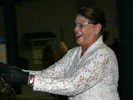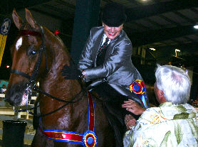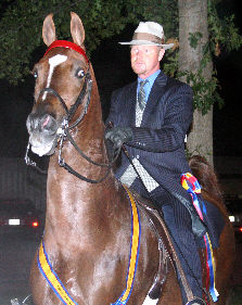 The show was brought to a close with five entries making the gate call for the Five-Gaited Jackpot Championship. After working through the gaits, Courageous Lord with Mike Barlow was called to the winner’s circle for Marsha Shepard and Bill Carrington. This bold moving chestnut first captured the attention of Shepard at the Dixie Cup a few years ago as a junior horse but when she went back to purchase him, he had already been sold. He had also captured the attention of Ron and Betty Moore who bought him to campaign in the junior division. That year under the direction of Lisa Heres-Rosenberger he accumulated quite a following and top ribbons at Louisville and at shows in the Southeast. When Rosenberger opened up her own stable, Courageous Lord was eventually sent back to the trainer who made him, Mike Barlow, and earlier this year Shepard and Carrington purchased him as they had intended to two years ago.