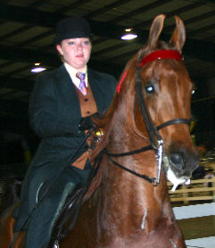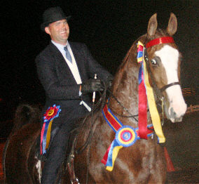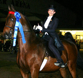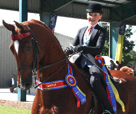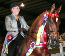 No stranger to the winner’s circle at this show, CH Yes It’s True turned in a winning performance in the Amateur Three-Gaited Championship for the second year in a row. This year Kathy Berger who purchased him the first of the year guided him to the top spot. This team also won the amateur qualifier. Reserve in the amateur championship hung on the Judd Stables banner with a super performance from Amber Lager and Anitya Marlowe. Earlier in the week they captured the Ladies Three-Gaited title. Reserve in both the amateur and ladies qualifier went to Mega Volt with Debbie Tolliver. After two nice performances they elected not to show back in the championship.