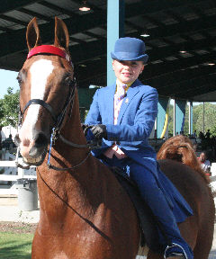 Natalie Sanchez was thrilled when her number was called to the winner’s circle in the Junior Exhibitor Three-Gaited Championship. She piloted the handsome Sky High Money to the top spot under the direction of Steve Old. Reserve honors went to Keeper Of The Stars and Jackie De la Parte. This elegant team earned the top spot in the 14-17 qualifier. In his only appearance Champagne’s Supreme Fox topped the 13 and under qualifier for the second year in a row. This year he was piloted to the blue ribbon by Morgan Gunby.