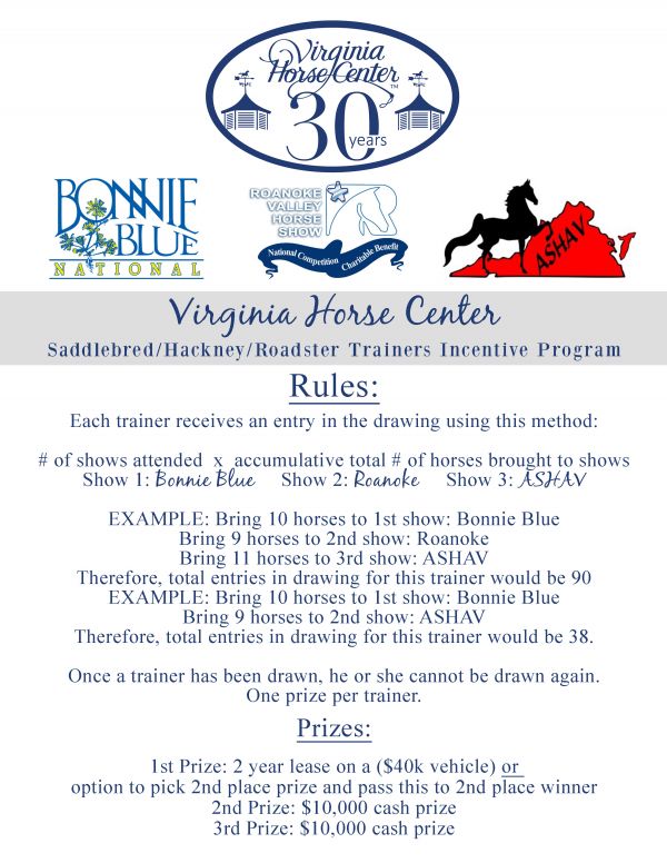 Lexington, Va. - March 10, 2016 - With a full-range of classes offered and great facilities, Saddlebred, Hackney and Roadster trainers already have good reason to plan to attend the Bonnie Blue National, Roanoke Valley and ASHAV Horse Shows at the Virginia Horse Center. Now, the Horse Center is giving one more reason to plan to attend these shows for 2016 - a newly instated, and lucrative, trainer incentive program!