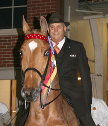Six top entries competing for the coveted Five-Gaited Championship burst through the gate to close out the show. It was a proud night for owner/breed Jean and Chris Nalley as Zippers & Snaps rose to the top while moving easily from gait to gait and never dropping an ear. Steve Wheeler successful campaigned the flashy bay daughter of Attaché’s Thunderbolt in 2007 in the junior division and began the 2008 season with not only the championship win but also the open mare qualifying blue. Reserve went to another beautiful bay mare, Radiante, winner of the 2007 Kentucky County Fair Championship. The bright mare, owned by Elmo Lee Greer, powered down the rail for Clark Clouse with her fan club from Clouse Stables cheering them on. Reserve in the open mare class when to the elegant Whimsicality with Michael Richardson presenting for Robert Grom in their only open appearance. Winning the stallion/gelding qualifier was Callaway’s Belfast with Mindy Preston in the irons for Linda Lewis. Garnering the red streamers was Callaway’s Front Man with Billie Rae Graham presenting for Tannehill Farms.