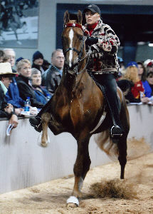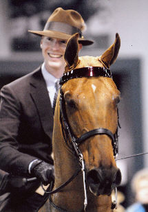 Fort Chiswell's Royal Champagne burst through the entry gates, capturing attention and demanding the sale's highest ticket of $35,000.00. Under the expert direction of Melinda Moore, up for the partnership of Dickey Davis and Melinda Moore, the five-gaited gelding displayed a bold trot and an expressive, true rack as he was called on to entertain the gallery. He has been shown lightly, winning the UPHA Five-Gaited Classic at Southeastern Charity in 2005 and the Junior Five-Gaited Class at the Kentucky Spring Premier in 2006. By CH Heir To Champagne and out of the Five-Gaited Mare World's Champion Royal Memories by Mountain Highland Memories, Fort Chiswell's Royal Champagne was bred to enjoy his work, and he expressed a willing confidence during his stay in the pavilion. The crowd responded with activity, finally settling as Marlene LaFleur, Verona, Wisconsin, signed her name to take home the grand prize.