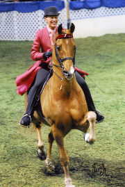 Excitement mounted as the Pink Ribbon Class approached, and those around the ring were not disappointed by the grand finale of the night. As the band struck up the theme from the Pink Panther, a golf cart decorated in pink ribbons entered the arena carrying the honorees of the Pink Ribbon class. These women – Chris Kaplan, Jonnie Surland, Peggy Webber, Kayce Bell, Diane Mead, Virginia Burbank, Reneaux Collins and Fern Bittner – were celebrated and honored by sponsors of the class for their courage and strength in battling breast cancer, and they received a standing ovation as they joined the officials in center ring to watch the class. Peter Fenton also read the names of honorees who could not be present: Julie Gates, Nan Adye, Fay Mullins McCurley, Charlotte Young Williams, Valerie Richardson, Barbara Morris, Anne Boyd, Karen Stout, Harriet Jones, Caryl Brammer, Lauren Heller, Teri Burke, Sue Breiner, Mary Catherine Pankey and Ena Felder. For a brief moment of quiet, those in the audience were left to their own thoughts and memories, and then, in that voice which builds drama better than any voice around, Peter Fenton declared: “And now with our honorees in center ring, we turn our attention to the in-gate where 10 more women are waiting to enter the ring. They will ride tonight to win the Ladies 5-Gaited National Championship; they will ride tonight to celebrate someone they love; they will ride tonight with hope and determination to find a cure.”