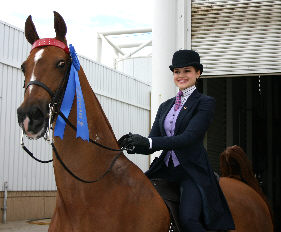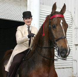 The Junior Exhibitor 14 and Under Three-Gaited class was filled with world-class action. The top three ribbons were awarded to current or former world’s champions. CH An Heir About Her and Marjorie Townsend earned the blue, with Ostentatiously and Brittany McGinnis, and That’s Chicago and Katie Cunningham following respectively in the ribbons.
