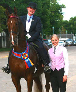 Alyssa Wick congratulates Jean Chappell after a great ride on Reedann’s Grand Phinale to win the Adult Country Pleasure Championship at Tanbark Cavalcade of Roses. The trio also won the Pro-Am class on Friday evening after Chappell won the Adult Country Pleasure qualifier with him.